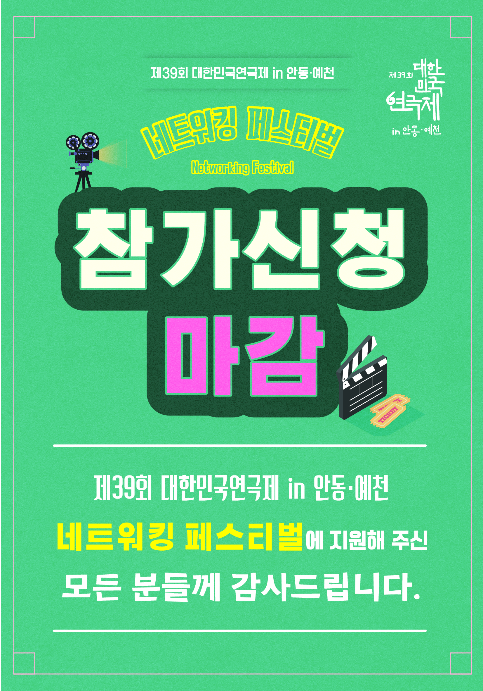 제39회 대한민국연극제 in 안동·예천 네트워킹 페스티벌(Networking Festival)에 지원해 주신 모든 분들께 감사드립니다.
